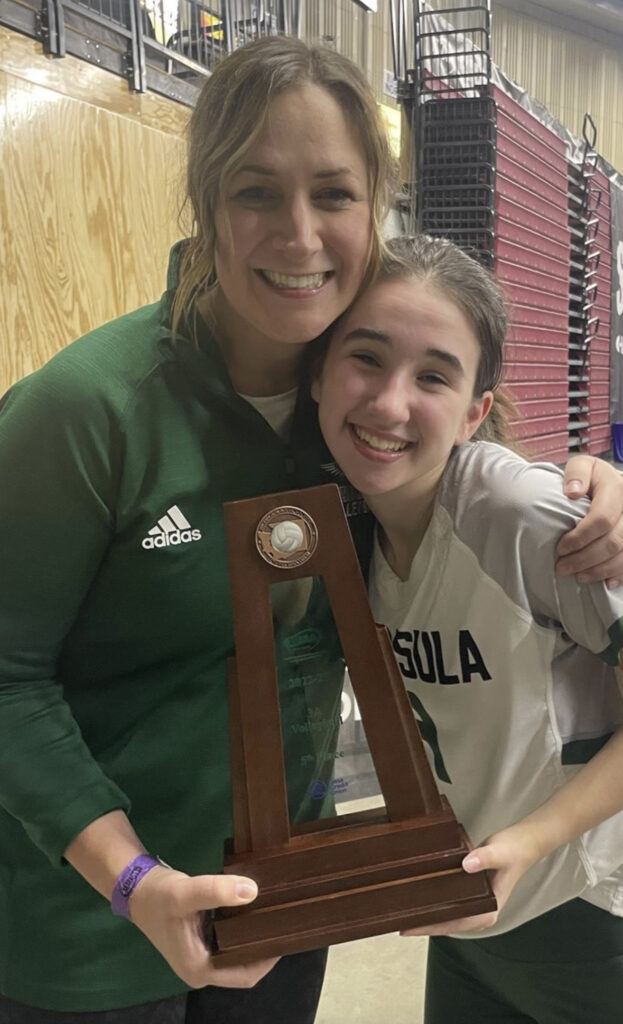 Peninsula volleyball coach Katrina Cardinal and her daughter Kate the hold the Class 3A state tournament fifth-place trophy in 2023. Photo courtesy Peninsla volleyball