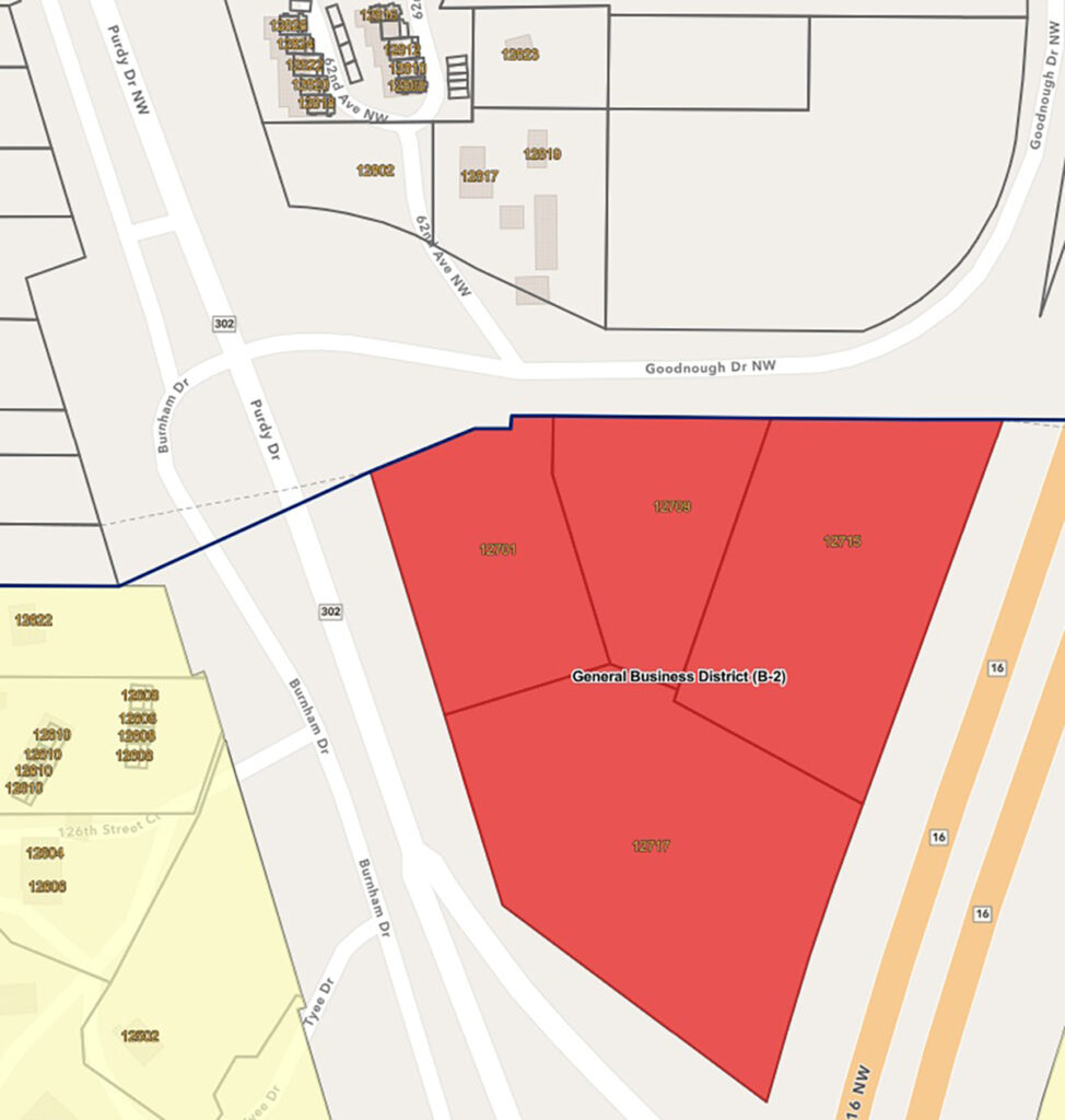 One of the largest — possibly the largest — unbuilt properties in Gig Harbor with B-2 zoning is a roughly triangular, 7.92-acre parcel wedged between Highway 16 and Purdy Drive/Highway 302 on the south side of Goodnough Drive.