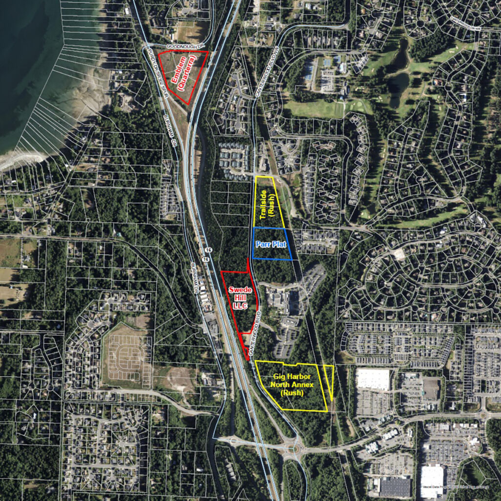 Development proposed on and near Canterwood Boulevard, from north to south: Emblem Gig Harbor on Goodnough Drive, 230 to 240 apartments; Trailside on Canterwood Boulevard, 120 units; Parr Plat, eight single-family homes; Swede Hill LLC property, site of both commercial and multifamily proposals; Gig Harbor North Annex, 108 apartments plus medical offices. Map by Tony De Paul, GIS specialist, Pierce County
