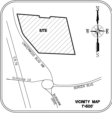 The Emblem Gig Harbor site’s northern border on Goodnough Drive is also the city’s northern border. (Fun fact: this site is in Gig Harbor but can only be reached by traveling outside the city, making it what geographers call a pene-exclave.)