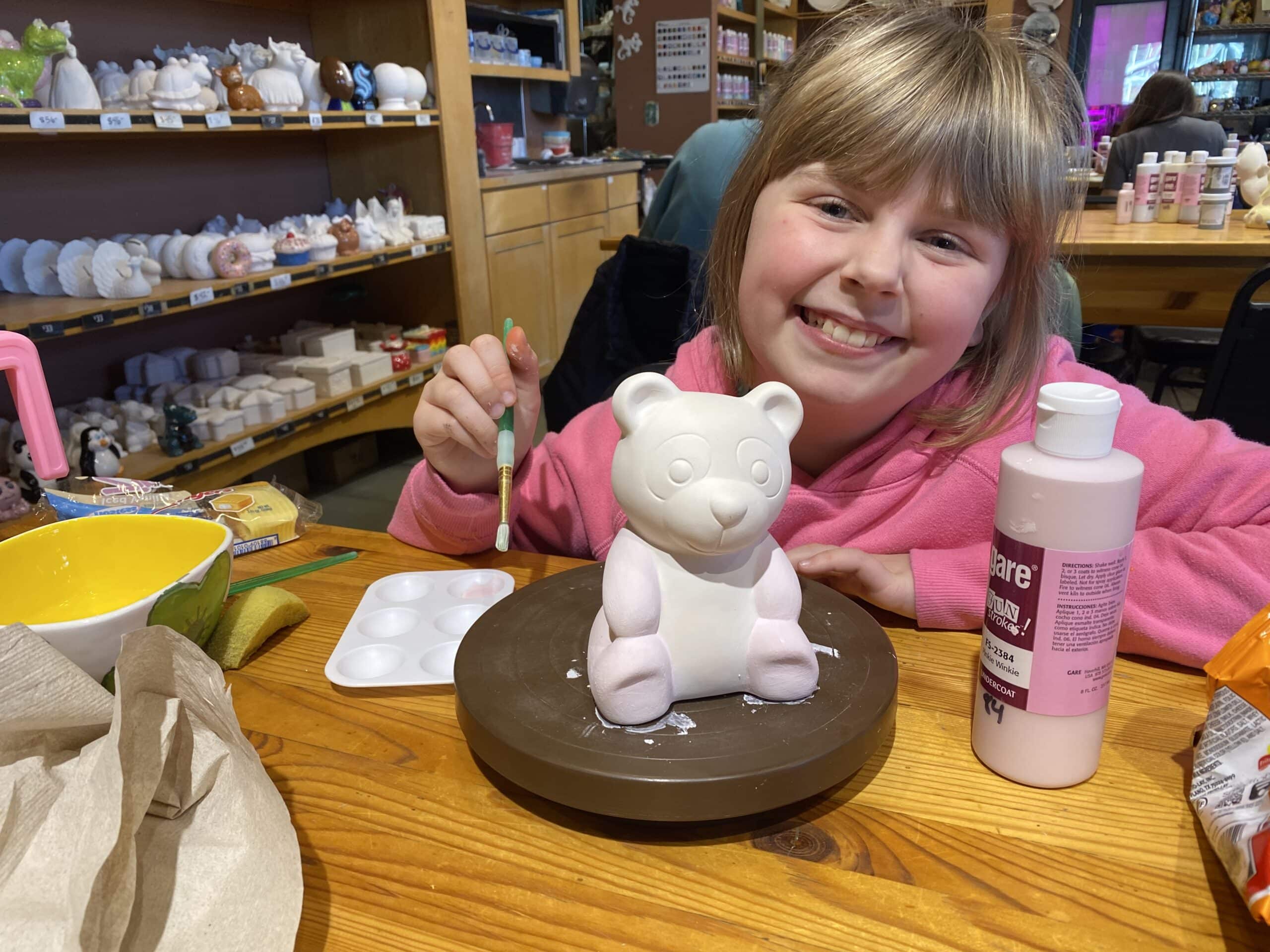 In the pottery studio side, the warm lighting, and hands-on tools like squeeze bottles and bristle-y brushes, mean you and the kids can spread out and get messy (in a good way). Plus, seeing other kids painting nearby adds to the excitement. The studio has total cozy vibes: terracotta-colored walls, lots and lots of wooden shelves with objects to select from, and big tables where everyone can do their own thing.