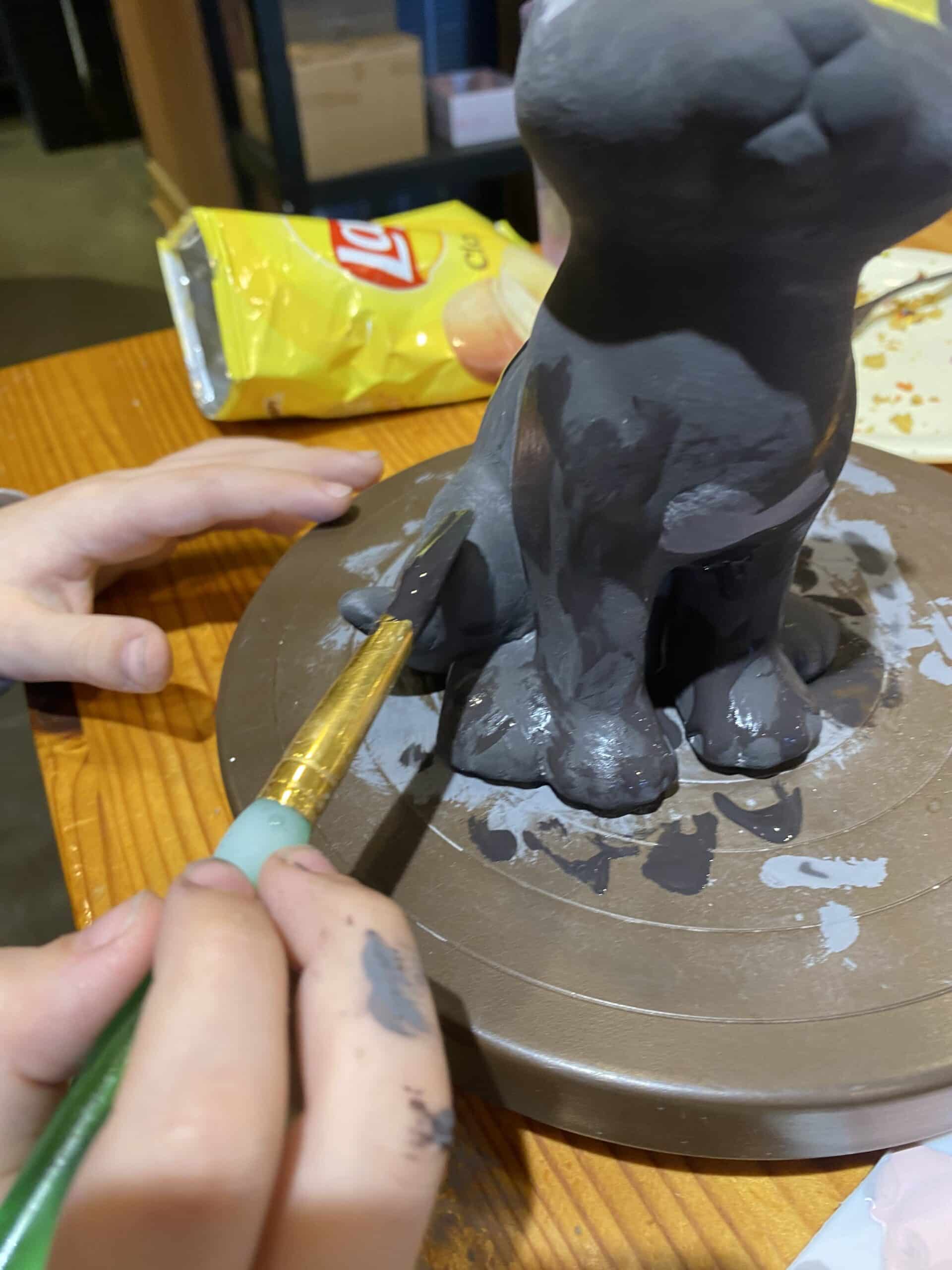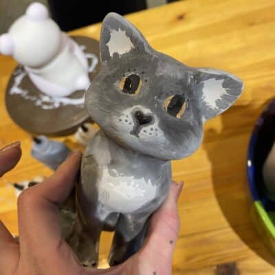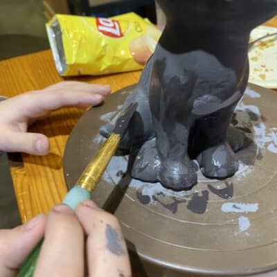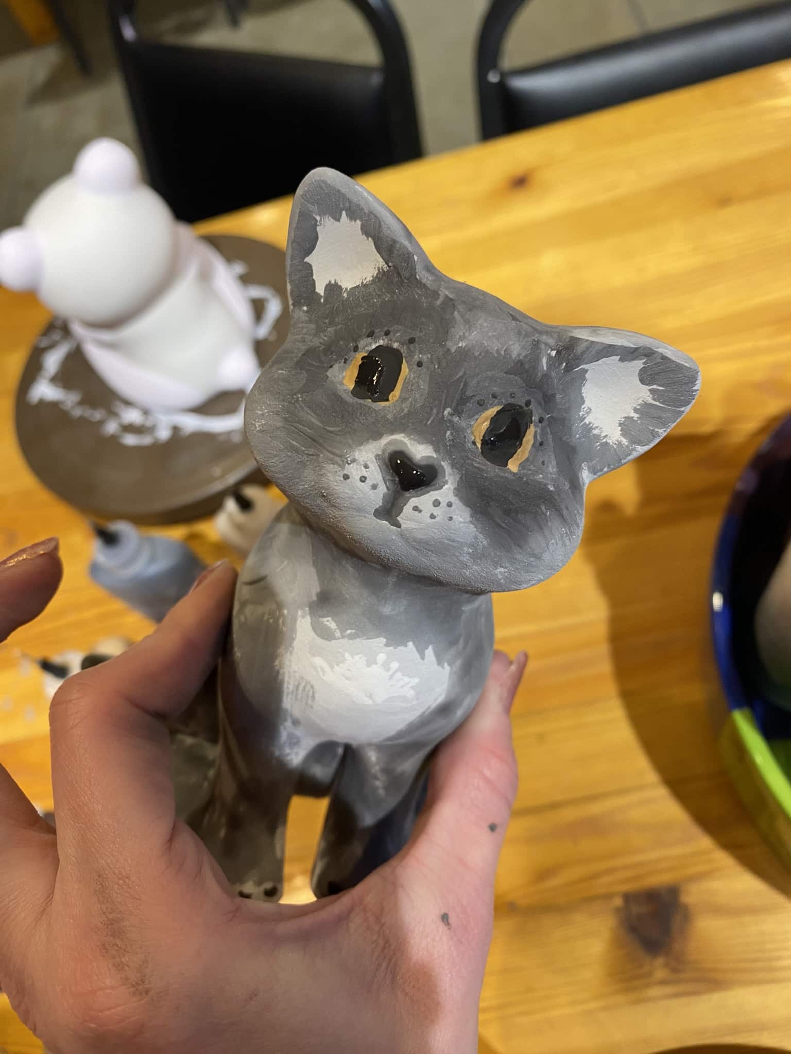 Here’s our visit in February 2024 when we ordered chips and hot chocolate from using the tableside service. We painted ceramic cats:
