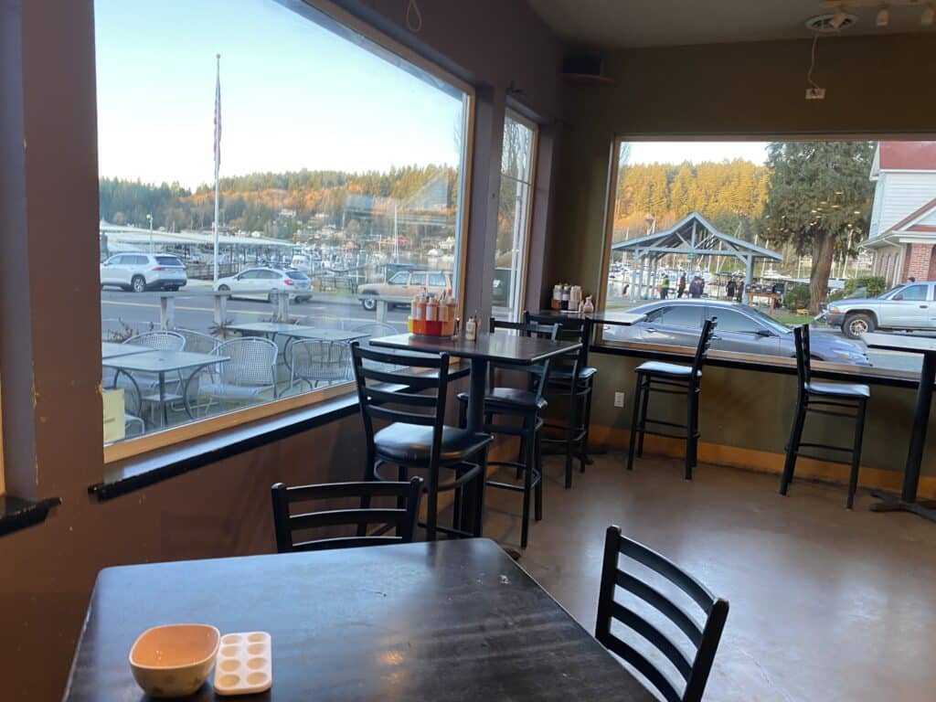 The building has two main hangouts: the café side facing Harborview Drive with its huge picture windows looking out to the water; and the pottery studio side. There’s also a parking lot for customers in the back. Inside, the two rooms are connected by an archway between a wall and a shared fireplace. The cafe is the walkup type with seating, or you can just grab-and-go. It also has a varied menu of drinks and snacks that’s open to everyone, even if you’re not painting.