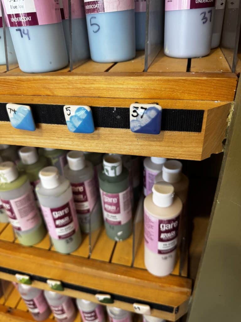 3. PAINT! Decorate your object with your choice of the shop’s many colored glazes and decorating tools. (We love the fine-tip squeeze bottles!) Additional glaze colors are organized on the wall, with glazed tile examples showing how the color looks after firing.