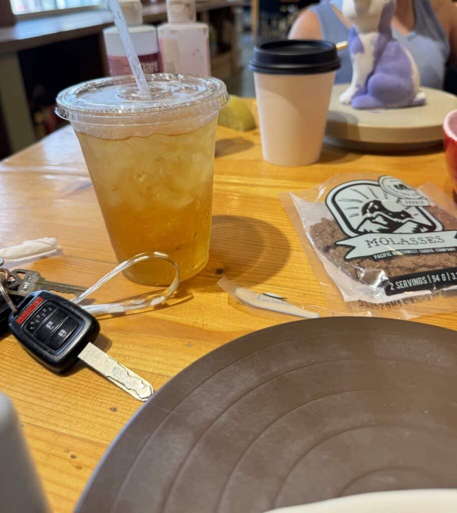 I ordered my first “Red Bull Spritzer” with a gluten free cookie from the cafe for table-side service while painting in June 2025. The spritzers didn’t have booze and are usually made with a can of chilled Red Bull, a flavored syrup, and ice. It may also have sparkling water in it.
