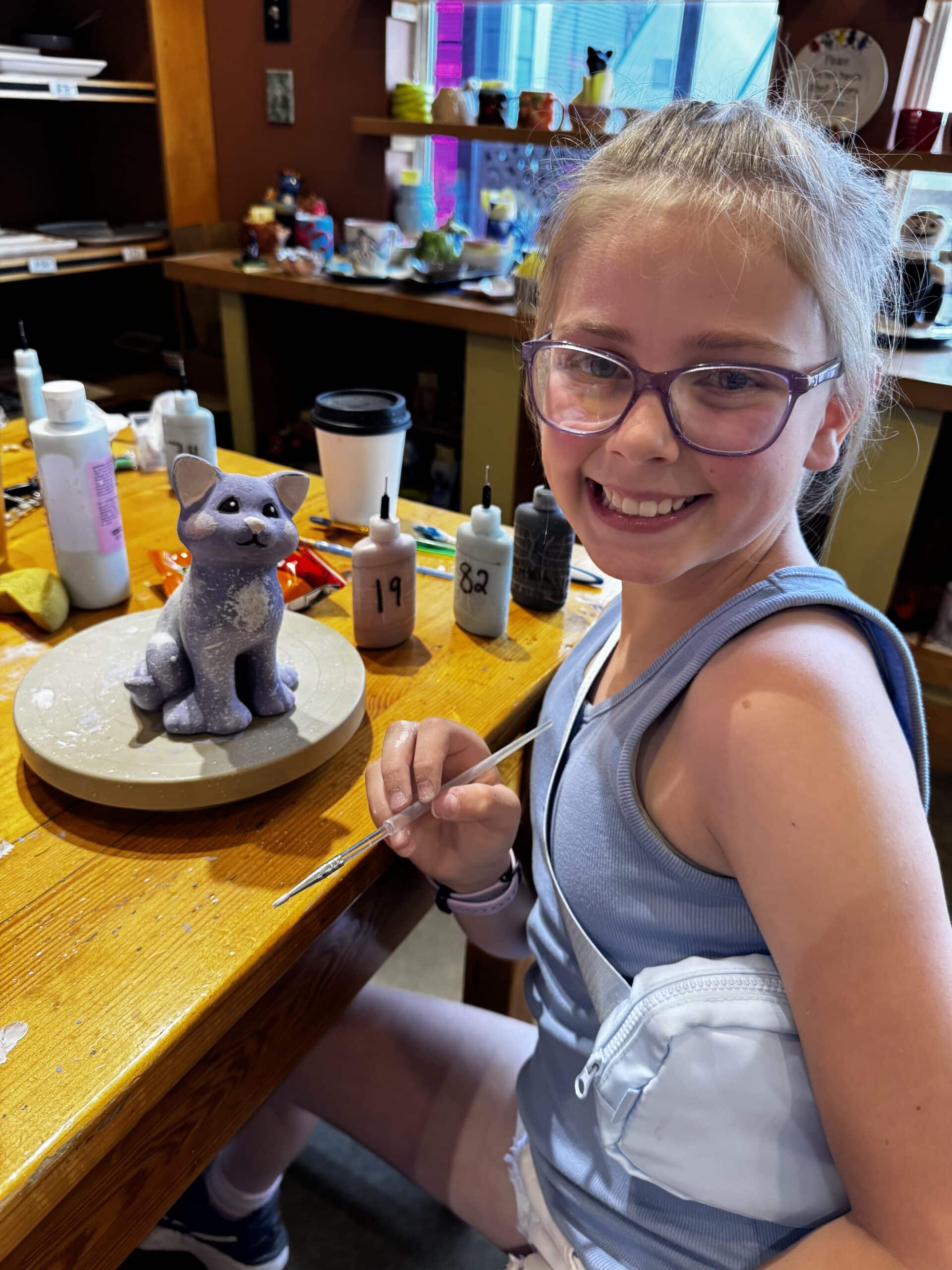 And here’s when we visited in June 2025 when we ordered cookies and hot chocolate. We painted cats again (yes, they were the same style of cat):