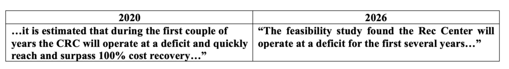 Does the 2026 statement come close to matching what PenMet said in 2020? The feasibility study did NOT say the CRC would operate at a deficit “…for the first several years.” PenMet said the CRC would